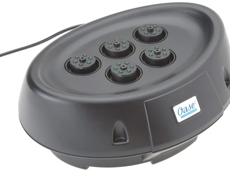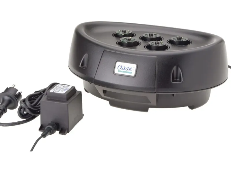 Mithilfe der 5 verstellbaren Düsen lassen sich die unterschiedlichen, bis zu 70 cm hohen Wasserbilder noch individuell einstellen, die dank der LED-Leuchtringe besonders in den Abendstunden in hellem Licht erstrahlen. Die 12 Volt-Technik ermöglicht sogar den Einsatz in Schwimm- und Badeteichen.