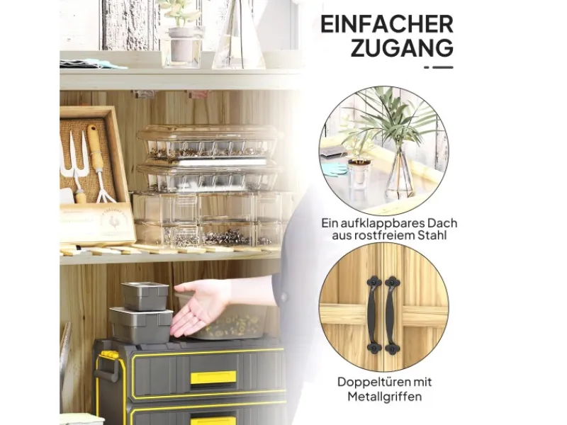 – Klappdach und Doppeltüren des Holzgeräteschranks ermöglichen einen einfachen Zugriff