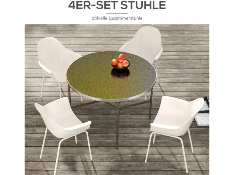 Entspannen Sie sich und genießen Sie die Natur zu zweit, mit diesem Set aus vier Gartenstühlen von Outsunny. Mit ihrem ergonomischen Design mit hoher Rückenlehne und Armlehnen bieten diese Stühle eine optimale Unterstützung für Ihren Körper. Sie sind aus komfortablem Kunststoff-Material gefertigt und bieten ein angenehmes Sitzerlebnis. Gönnen Sie sich eine ruhige und entspannte Zeit mit unseren zuverlässigen Metall-Gartenstühlen.
