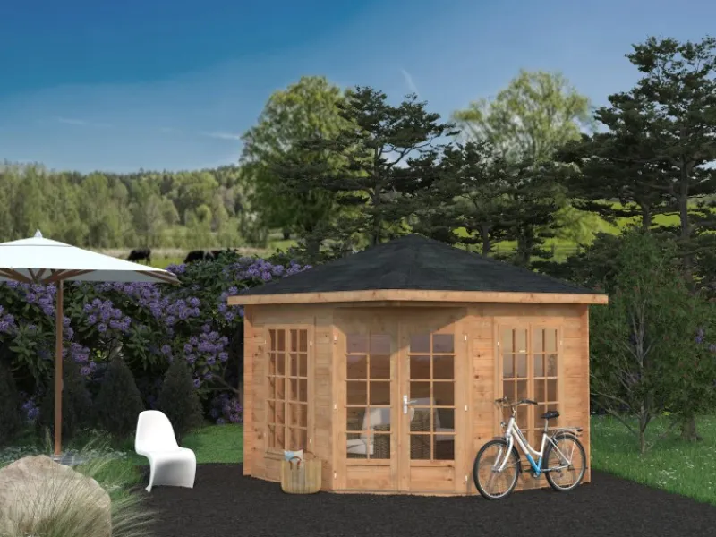 Palmako Holz-Pavillon Melanie 7,0 m² aus braun tauchgrundierten 28 mm Blockbohlen mit winddichter Chaletschnitt-Eckverbindung mit Eckeinstieg. Die stabile, teilverglaste Doppeltür mit Leimholzrahmen und Zylinderschloss verfügt über niedrige, mit Edelstahl abgedeckte Türschwelle. Die Doppeltür und tiefe, nach Außen öffnende Doppelfenster haben Einfachverglasung und aufgesetzte Sprossen. Zum Bausatz gehören auch imprägnierte Fundamenthölzer, 16 mm Dachbretter und 19 mm Fußbodenbretter mit Nut und Feder, Sturmleisten, sowie Montageset. Der Pavillon ist bereits mit einer Tauchgrundierung versehen und kann nach dem Aufbau mit allen handelsüblichen Farben weiterbehandelt werden. Dacheindeckung ist nicht im Lieferumfang enthalten.