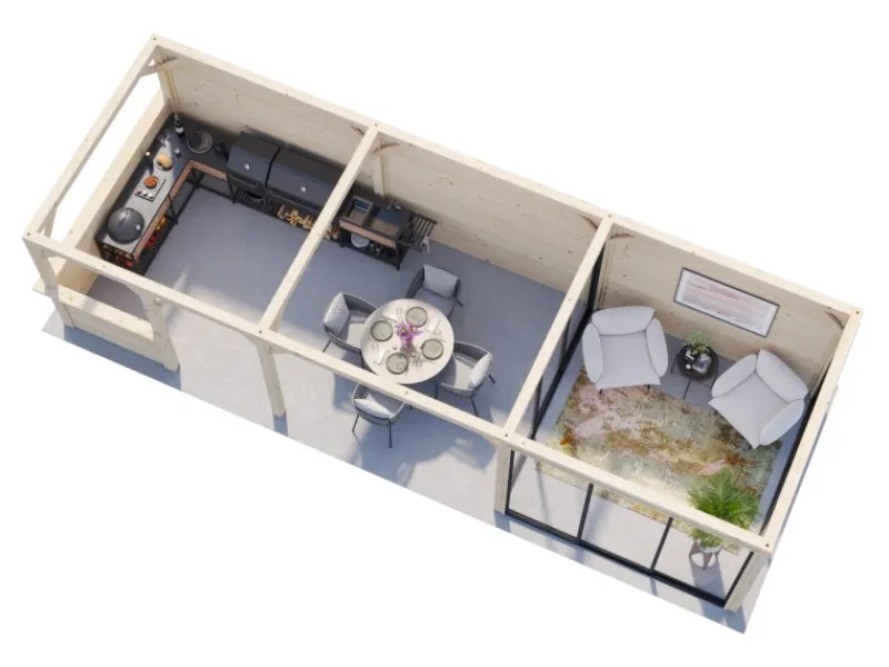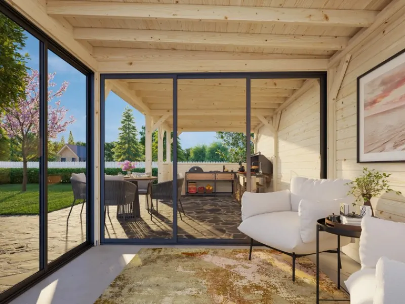Die Schiebetüren können in beide Richtungen geöffnet werden und sind mit einem PZ-Schloss ausgestattet. Massive Leimholzpfosten sowie 19 mm Dachbretter bilden die Basis. Ein Fußboden, Dacheindeckung und Regenrinne sind optional lieferbar. Der Pavillon wird aus nordischem Fichtenholz gefertigt und ab Werk im Farbton Weiß RAL9016 lackiert.