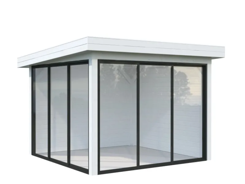 Genießen Sie die ersten Sonnenstrahlen im Frühjahr hinter den geschlossenen Türen, oder nutzen Sie den Pavillon bei schlechtem Wetter, die Möglichkeiten werden Ihnen Freude bereiten. Massive Leimholzpfosten sowie 19 mm Dachbretter bilden die Basis der Pavillons. Ein Fußboden, Dacheindeckung und Regenrinne sind optional lieferbar. Der Pavillon wird aus nordischem Fichtenholz gefertigt und ab Werk im Farbton Weiss RAL9016 lackiert.