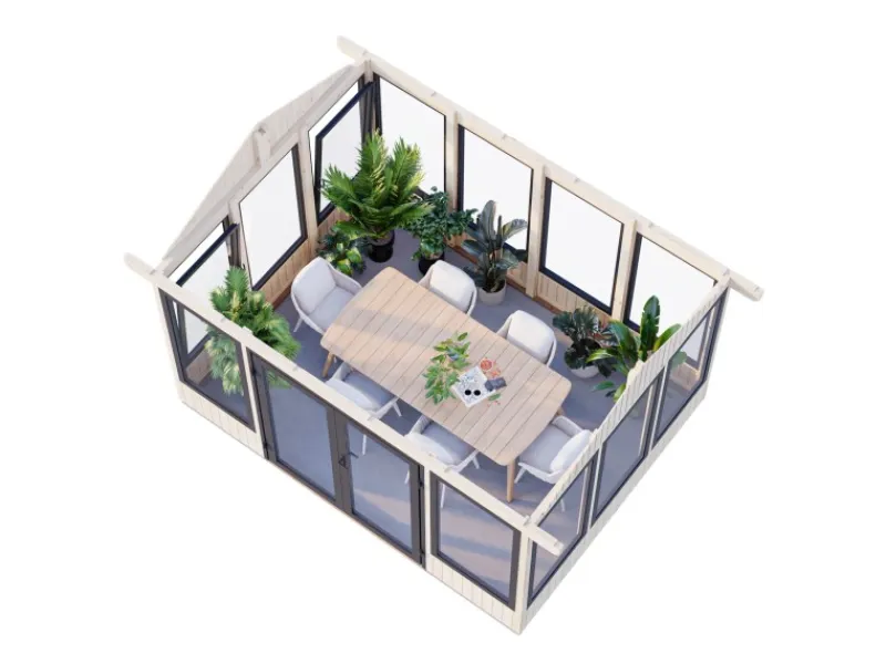 Das Satteldach-Haus wird aus unbehandeltem, nordischen Fichtenholz gefertigt, sowohl die Aluminium-Doppeltür als auch die Aluminium-Fenster verfügen über 4 mm Verglasung. Ein Montage-Set ist im Lieferumfang enthalten, Dacheindeckung und ein Regenrinnen-Set sind optional erhältlich. Das Haus kann spiegelverkehrt aufgebaut werden. Versehen Sie das Haus nach dem Aufbau mit einer Grundierung und einem Anstrich zum Schutz gegen Witterungseinflüsse. Das Haus wird ohne Fußboden geliefert.