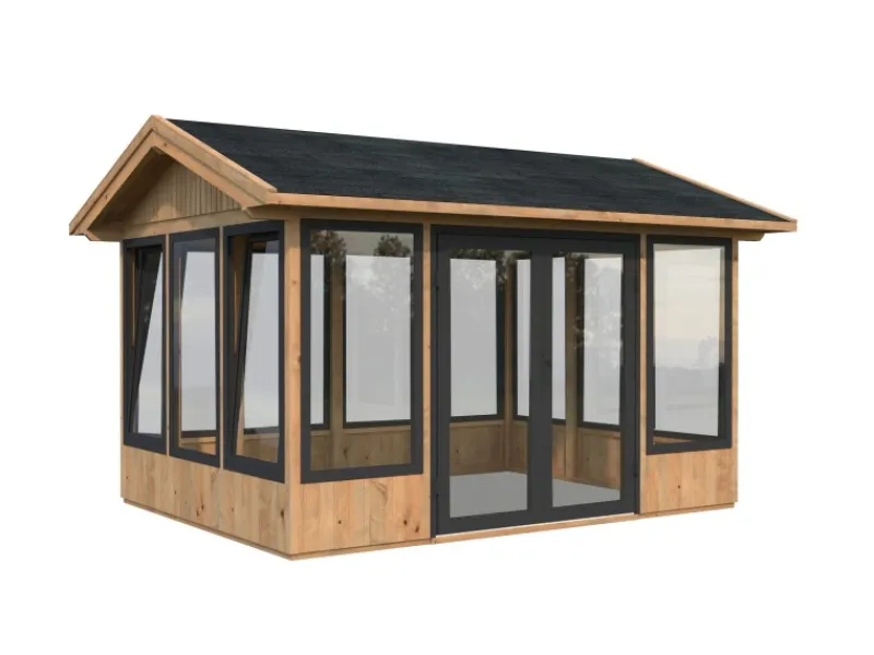 Das Satteldach-Haus wird aus braun tauchgrundiertem, nordischen Fichtenholz gefertigt, sowohl die Aluminium-Doppeltür als auch die Aluminium-Fenster verfügen über 4 mm Verglasung. Ein Montage-Set ist im Lieferumfang enthalten, Dacheindeckung und ein Regenrinnen-Set sind optional erhältlich. Das Haus kann spiegelverkehrt aufgebaut werden. Das Gartenhaus wurde bereits mit einer Tauchgrundierung versehen und benötigt nach dem Aufbau einen Endanstrich. Das Haus wird ohne Fußboden geliefert.