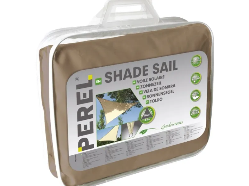 Das braun-graue Perel Dreieck-Sonnensegel eignet sich hervorragend als Sonnenschutz für Terrassen oder Gärten. Es bietet einen UV-Schutz von 90 % und ist wasserabweisend. Die Seiten sind bogenförmig, damit das Segel gespannt bleibt. Des Weiteren ist es mit D-Ringen (Metall, verzinkt) an allen Ecken ausgestattet und waschmaschinenfest.