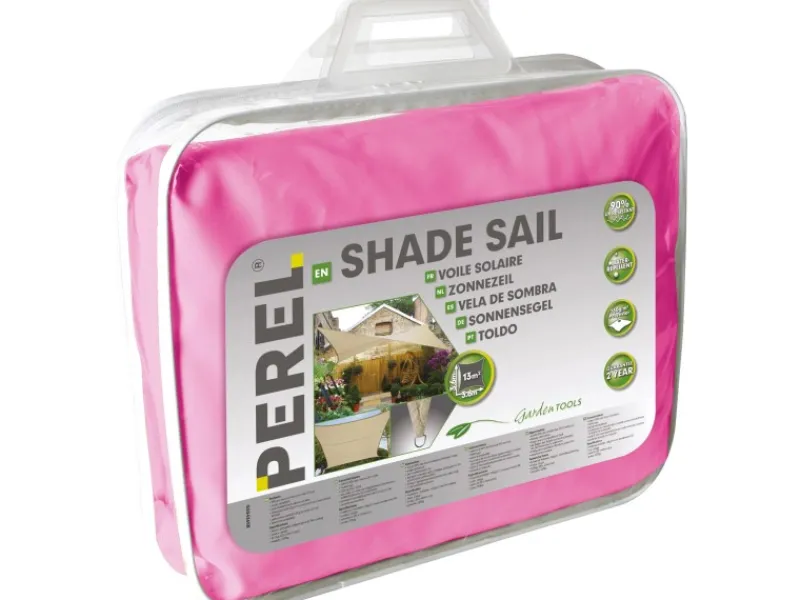 Das fuchsiafarbene Perel Viereck-Sonnensegel eignet sich hervorragend als Sonnenschutz für Terrassen oder Gärten. Es bietet einen UV-Schutz von 90 % und ist wasserabweisend. Die Seiten sind bogenförmig, damit das Segel gespannt bleibt. Des Weiteren ist das Sonnensegel mit D-Ringen (Metall, verzinkt) an allen Ecken ausgestattet und waschmaschinenfest.