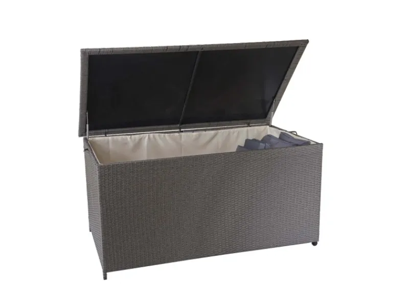 Die Truhe lässt sich vielseitig einsetzen: als Aufbewahrungslösung oder als Buffettisch bei Outdoor-Veranstaltungen. Dank des verstärkten Deckels kannst Du sie problemlos belasten und gleichzeitig für Ordnung im Garten oder auf der Terrasse sorgen. Alles, was sonst im Weg liegt, findet einen sicheren Platz.