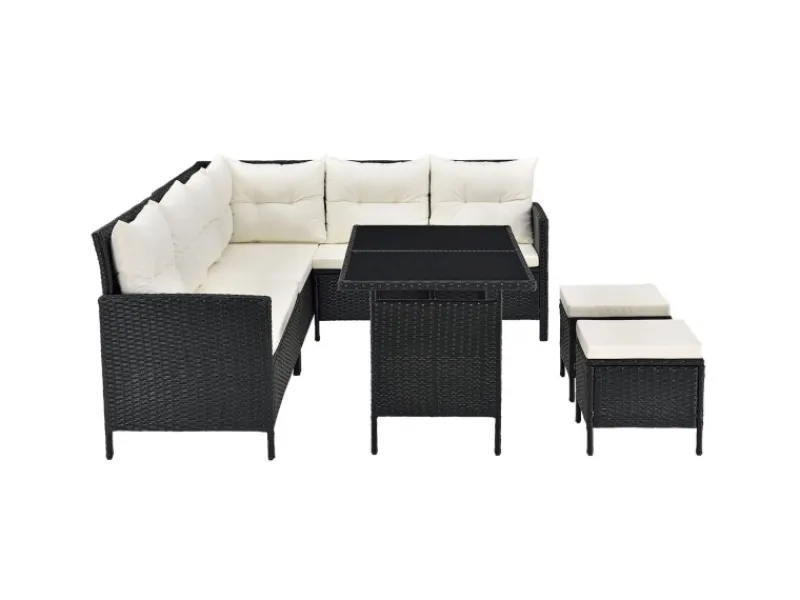 Die 5 cm dicken Sitzpolster erlauben es Ihnen über Stunden hinweg weich zu sitzen. Auch beide Hocker sind mit Auflagen ausgestattet. Sieben weitere Rückenkissen polstern Ihren Rücken weich ab.