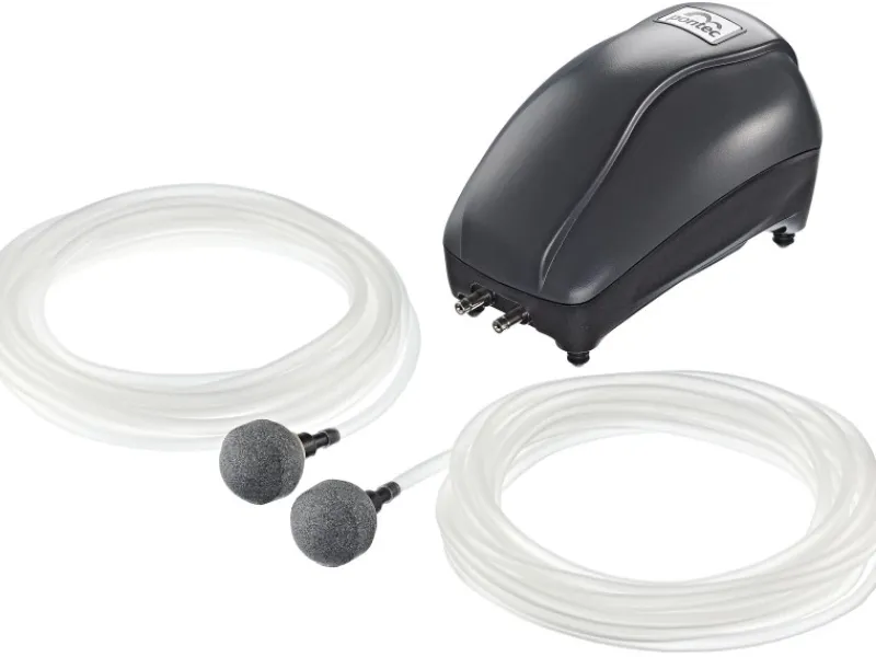 Gute Luft für den Teich: das Luftpumpenset PondoAir Set 200 sorgt für zusätzlichen wertvollen Sauerstoff für Flora und Fauna. Mit einer Leistungsaufnahme von nur 4 Watt trägt es so zu einem ausgeglichenen Teichklima bei und entlastet den Filter. Die Membranpumpe ist dank der Sicherheitstechnik IP 44 vor Spritzwasser geschützt. Mit 200 l/h pumpt sie die Luftblasen durch zwei Ausströmersteine in das Wasser. Im Lieferumfang enthalten sind zwei Luftschläuche à 5 m, 2 Ausströmer sowie 1,5 m Gummikabel. Unser Qualitätsversprechen: 2 Jahre Garantie!