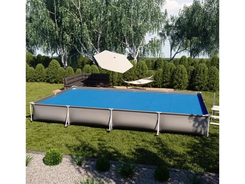 Die blaue Poolheizung schützt das Wasser vor Schmutz und ist witterungsbeständig