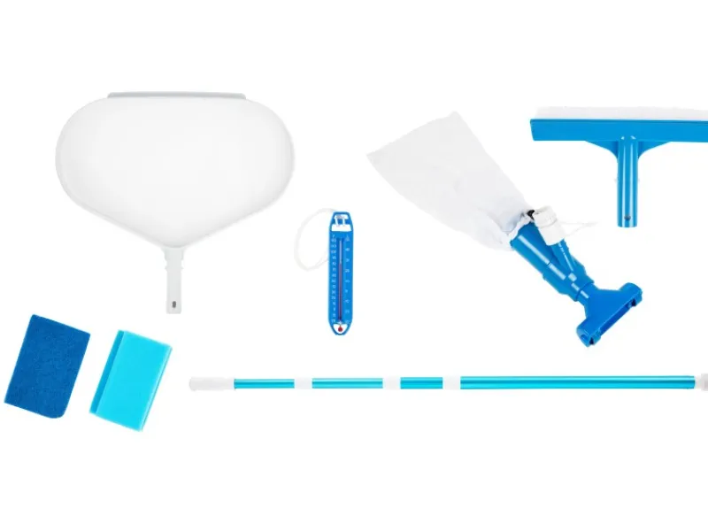 Der im Set enthaltene Laubkescher ist universell für Pools, Teiche oder Biotope einsetzbar. Er dient zur Entfernung von groben Verunreinigungen, wie zum Beispiel Laub und Insekten. Eine Aufnahme für handelsübliche Teleskopstangen ist bereits serienmäßig vorhanden. Mithilfe des Bodensaugers kann dann auch der Poolboden von Verschmutzungen befreit werden. Er wird einfach an einen Gartenschlauch angeschlossen und saugt dann mittels Venturi-Prinzip am Boden liegende Verschmutzungen direkt in den Auffangbehälter.