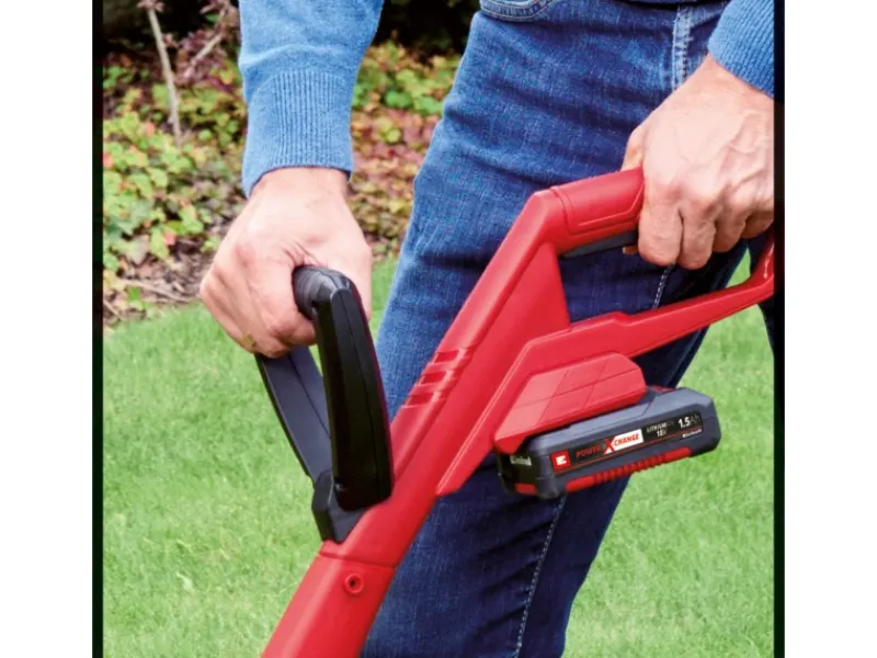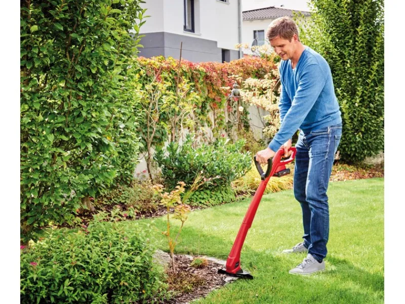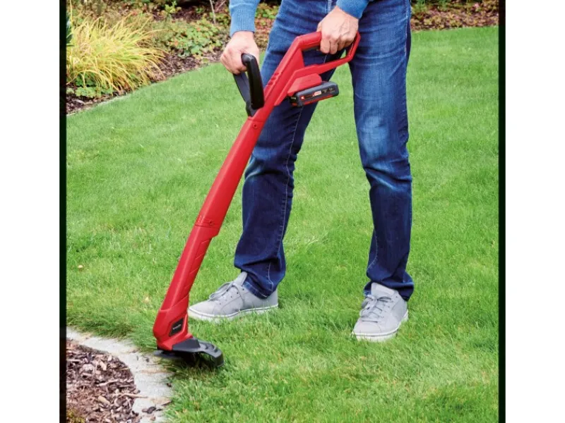 Durch den Zusatzhandgriff kann der Rasentrimmer bequem mit zwei Händen bedient werden. Bei der Ausführung von Gehäuse und Zusatzgriff wurde auf Langlebigkeit Wert gelegt, sie sind aus schlagzähem, hochwertigem Kunststoff gefertigt. Mit bis zu 8.500 Umdrehungen pro Minute arbeitet der Akku-Rasentrimmer kraftvoll auf einer Schnittbreite von bis zu 24 Zentimetern.