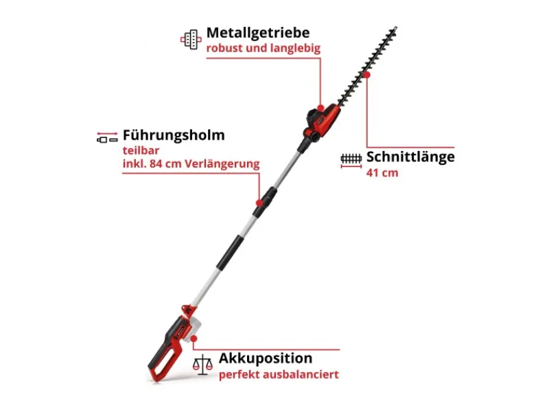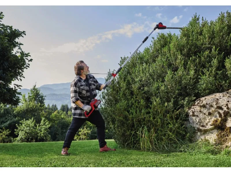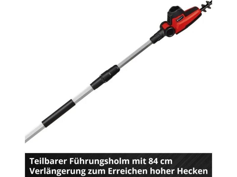 Die Langstiel-Heckenschere ist mit einem 7-fach neigbaren Motorkopf ausgestattet. Auch der Hauptgriff lässt sich um 90° drehen, sodass Sie immer mit einer angenehmen Haltung Ihre Hecke schneiden – ganz egal, ob horizontale Schnitte an der Oberseite oder seitliche Schnitte entlang der Hecke. Mit dem praktischen Teleskopstiel erreichen Sie auch hohe Hecken- oder Baumpartien mühelos. Der Stiel der lässt sich um 67 cm verlängern.