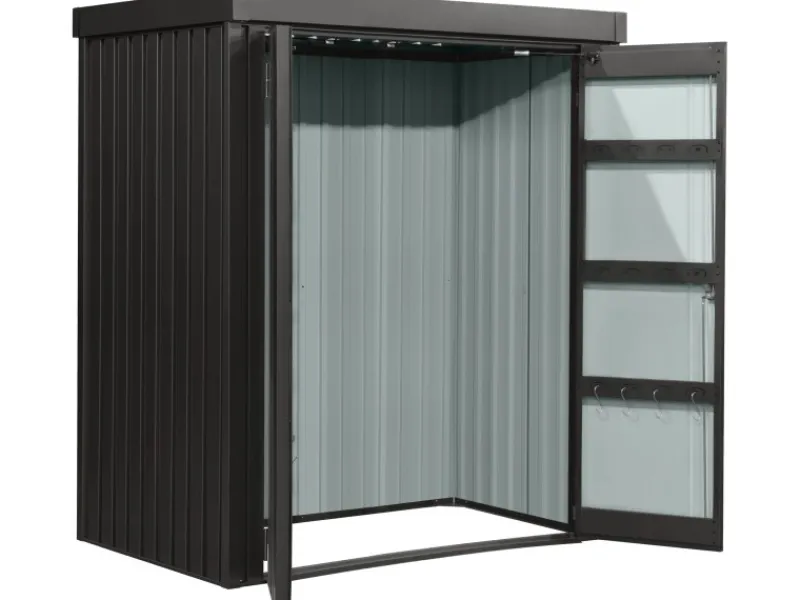 Der Premium Geräteschrank ist in Metallic-Grau gehalten und hat ein Flachdach. Der Schrank hat Doppel-Flügeltüren mit niedrigem Einstieg. Sie sind außen mit 2 Aluminiumstreifen verziert und innen sind je 4 Werkzeuggerätehaken angebracht. Sie sind abschließbar mit 2 Schlüsseln. Das Flachdach ist wasserdicht und hat eine Schneelast von 150 kg/qm. Regenrinne und 2 Wasserauslässe sind integriert. Bodenbefestigungsmaterial für eine bessere Stabilität ist im Lieferumfang enthalten.