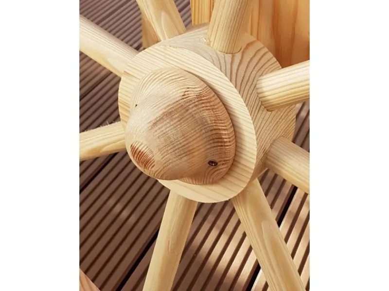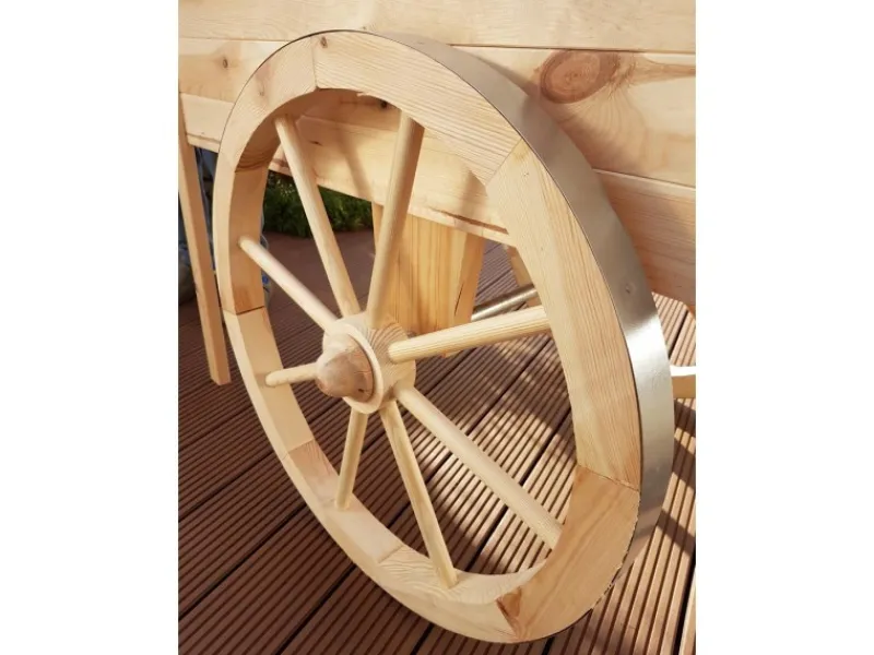 Der Marktwagen von Promadino ist ein echter Blickfang. Zum Einsatz kommt er als Deko- oder Displayartikel. Aber auch als Beistell- oder Grillwagen auf der Gartenterrasse macht er eine gute Figur. Der originalgetreue Nachbau eines Marktwagens wird aus naturbelassenem Kiefernholz hergestellt. Die drehbaren Speichenräder sind mit einer verzinkten Metallbereifung ausgestattet. Der Baldachin ist in weiß/blau gestreift. Maße Länge 173 cm x Breite 82 cm x Höhe 184 cm. Gewicht ohne Verpackung: 35,5 kg.