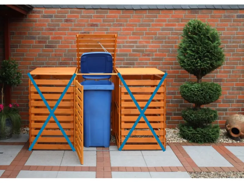 Diese formschöne, stabile, aus massivem Kiefernholz gefertigte Erweiterung für Mülltonnenbox Vario V lässt unansehnliche Mülltonnen einfach verschwinden. Passend für alle Tonnen bis 240 Liter. Die praktische Klappe ist mit einer Kette ausgestattet, damit man mit einer Hand beim Öffnen der Müllbox gleichzeitig auch die Mülltonne öffnen kann. Die Stahlschiene am Boden verleiht der Box zusätzliche Stabilität und die Rückwand ist verkleidet. Die Erweiterung für Mülltonnenbox Vario V ist bereits werkseitig Honigbraun imprägniert. Maße (H x B x T): 122 cm x 70 cm x 92 cm