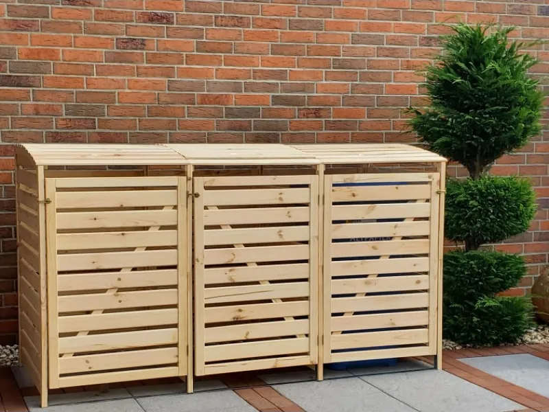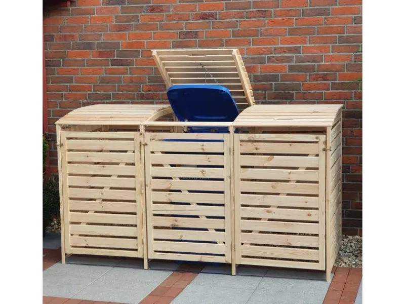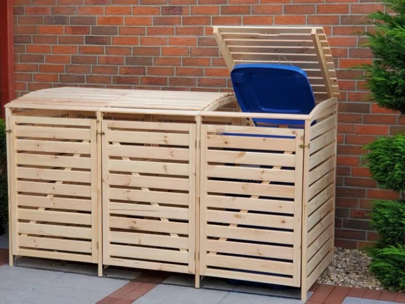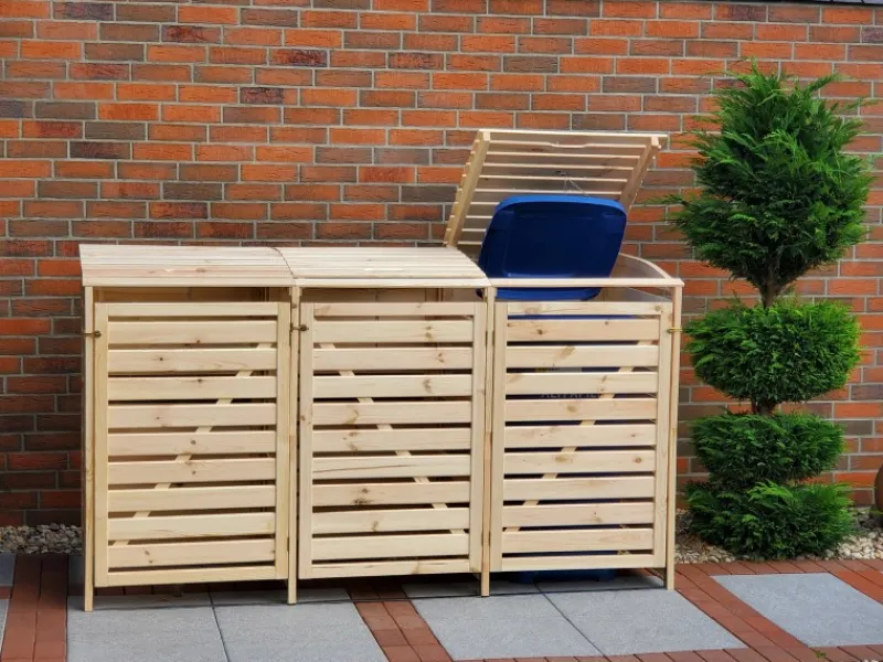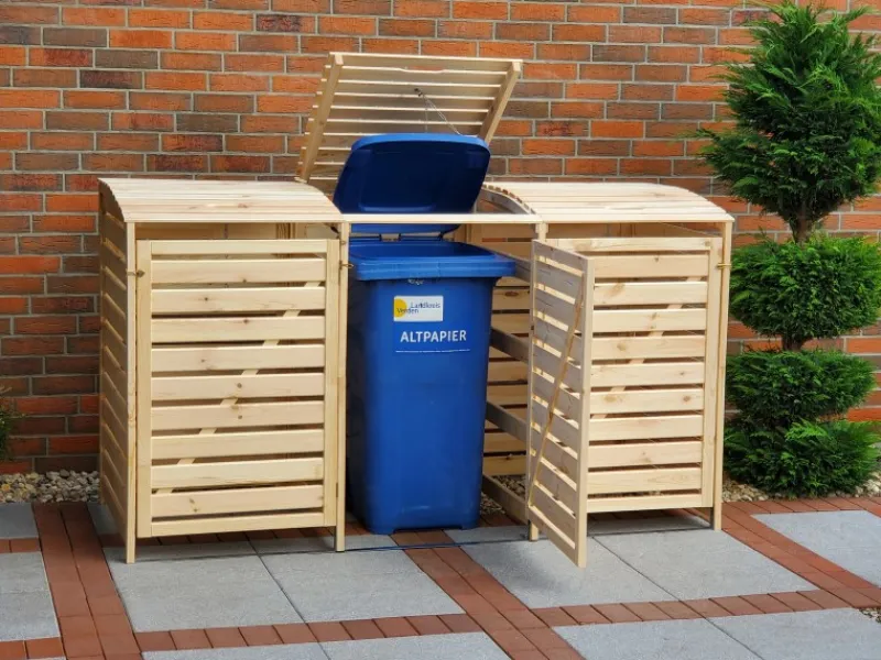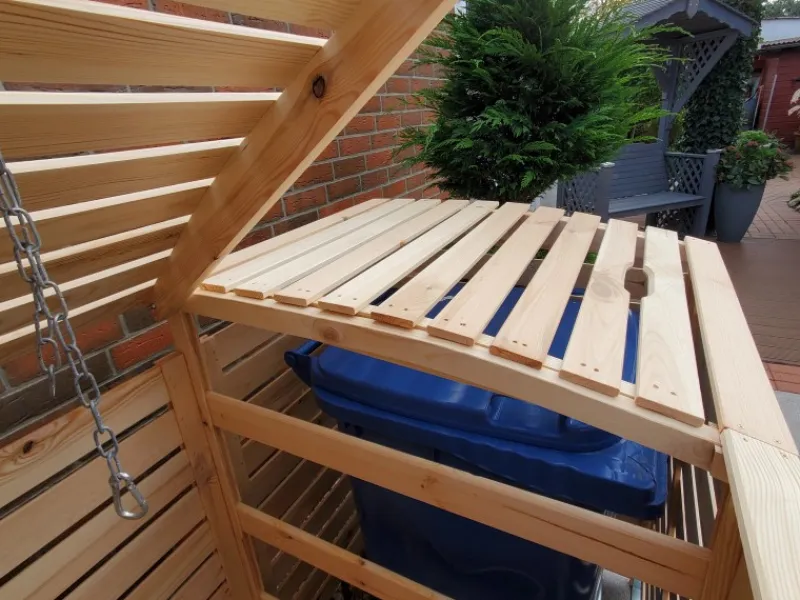 Die praktische Klappe ist mit einer Kette ausgestattet, damit man mit einer Hand beim Öffnen der Müllbox gleichzeitig auch die Mülltonne öffnen kann.