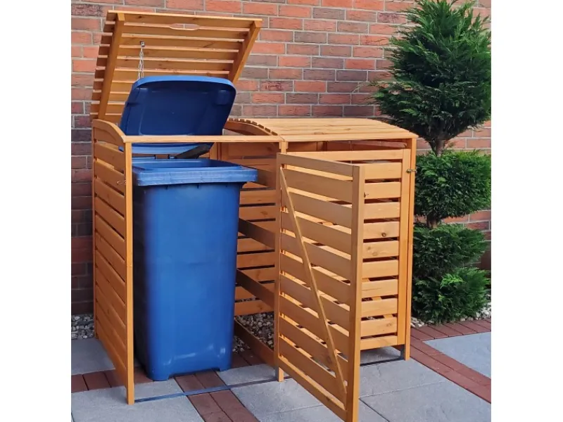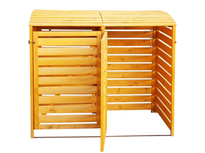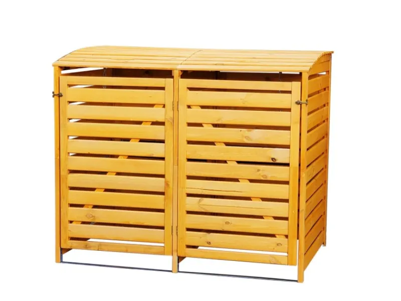 Die Promadino Mülltonnenbox Vario III überzeugt durch ihre hohe Stabilität und ihr formschönes Design. Die Mülltonnenverkleidung ist aus robustem Kiefernholz in einem warmen Honigton gefertigt und bietet eine freundliche Optik. Mit dieser Müllbox lassen Sie Ihre Mülltonnen elegant verschwinden. Ausgelegt ist die Mülltonnenverkleidung für zwei Mülltonnen mit einem Fassungsvolumen von maximal 240 l. Die Mülltonnenbox verfügt über eine verkleidete Rückwand und kann so auch frei aufgestellt werden. Die Klappe ist mit einer praktischen Kette ausgestattet, die einfach am Deckel Ihrer Mülltonnen befestigt wird. So öffnet sich der Deckel Ihrer Mülltonne beim Öffnen der Klappe gleich mit und Sie benötigen nur eine Hand. Das Holz ist Durch seine Imprägnierung witterungsbeständig. Am Boden der Box befinden sich zwei Stahlschienen, die für ein hohes Maß an Stabilität und einen sicheren Stand sorgen.