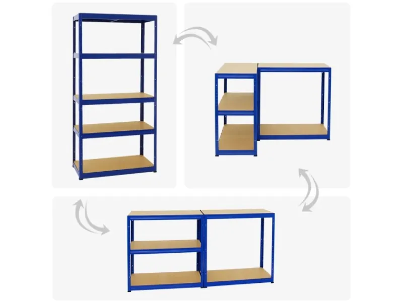 Das Metall ist pulverbeschichtet, um eine lange Lebensdauer sicherzustellen und entgratet, um unangenehme Schnittkanten zu beseitigen. Der Aufbau ist einfach und erfolgt durch Steckmontage mit dem Butterfly-System. Es genügt ein Gummihammer. Um den Schwerlastregalen zusätzliche Stabilität zu geben, können die Regale an der Wand verschraubt werden. Natürlich ist die Verbindung der Regalen untereinander möglich. Darüber hinaus können die Regale jeweils in zwei Werkbänke umfunktioniert werden. Hierfür lassen sich die vertikalen Streben in der Mitte teilen, um so zwei separate Werktische bauen zu können.