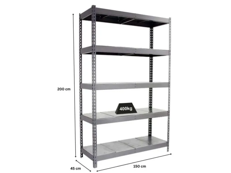 Das Schwerlastregal ist 200cm hoch, 150cm breit und 45cm tief. Die Regalfarbe ist Grau.