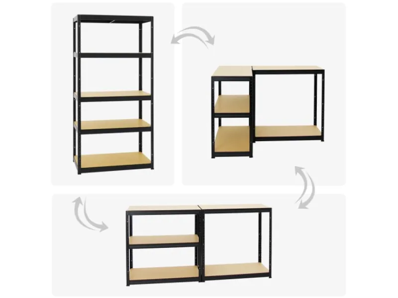 Das Metall ist pulverbeschichtet, um eine lange Lebensdauer sicherzustellen und entgratet, um unangenehme Schnittkanten zu beseitigen. Der Aufbau ist einfach und erfolgt durch Steckmontage mit dem Butterfly-System. Es genügt ein Gummihammer. Um dem Schwerlastregal zusätzliche Stabilität zu geben, kann das Regal an der Wand verschraubt werden. Auch die Verbindung von mehreren Regalen ist möglich. Darüber hinaus kann das Regal in zwei Werkbänke umfunktioniert werden. Hierfür lassen sich die vertikalen Streben in der Mitte teilen, um so zwei separate Werktische bauen zu können.