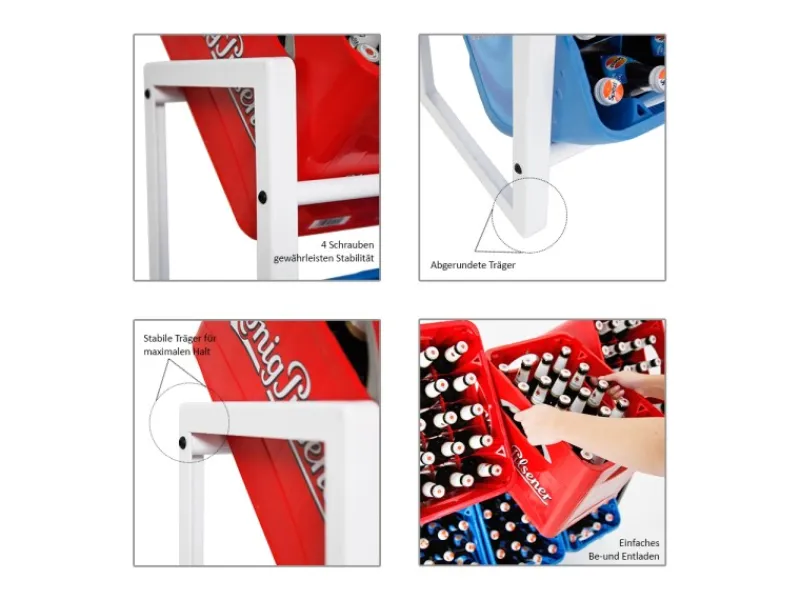 Die Streben lassen sich mit 4 Schrauben ganz einfach am Rahmen montieren. Sie brauchen sich keine Gedanken über den richtigen Winkel zum aus-und einräumen machen. Dies haben wir bereits für Sie getan und den perfekten Winkel für Sie herstellen lassen. Natürlich lassen sich nicht nur Getränkekisten in dem Regal lagern, sondern auch eine Vielzahl an anderen möglichen Kisten, wie bspw. einem Karton für Leergut.