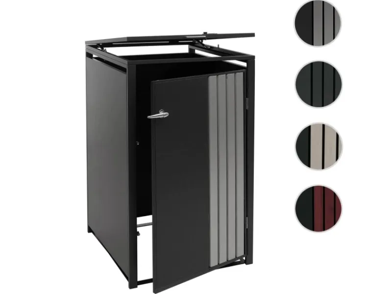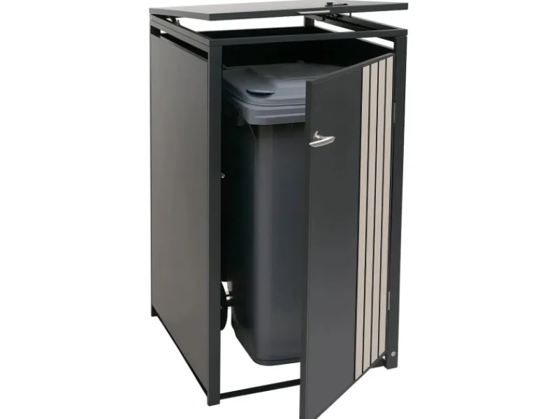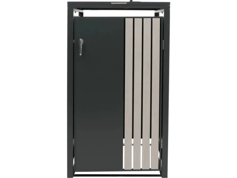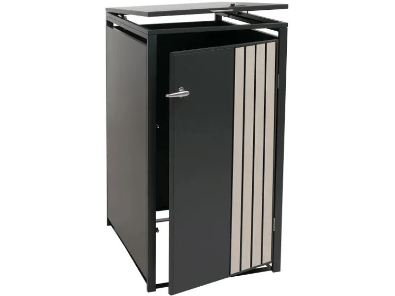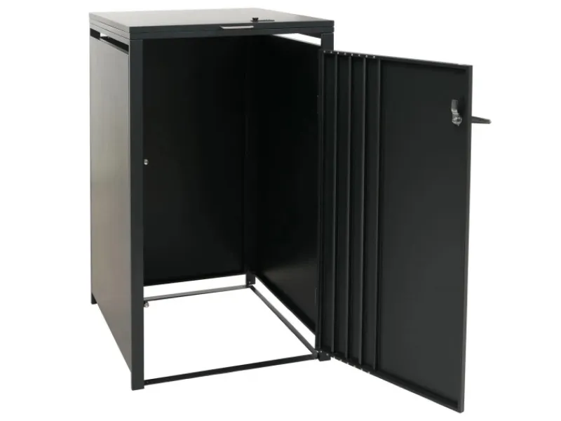 Dank der robusten Bauweise aus verzinktem Stahl überzeugt die Mülltonnenverkleidung durch ihre Wetterbeständigkeit und lange Lebensdauer. Die abschließbaren Türen schützen den Inhalt zuverlässig, während Belüftungsschlitze eine optimale Luftzirkulation gewährleisten. Durch das klare, moderne Design fügt sich die Verkleidung harmonisch in jede Umgebung ein – ob im Garten, an der Hauswand oder in der Einfahrt. Eine praktische und zugleich ästhetische Lösung, um Ordnung und Stil im Außenbereich zu schaffen.