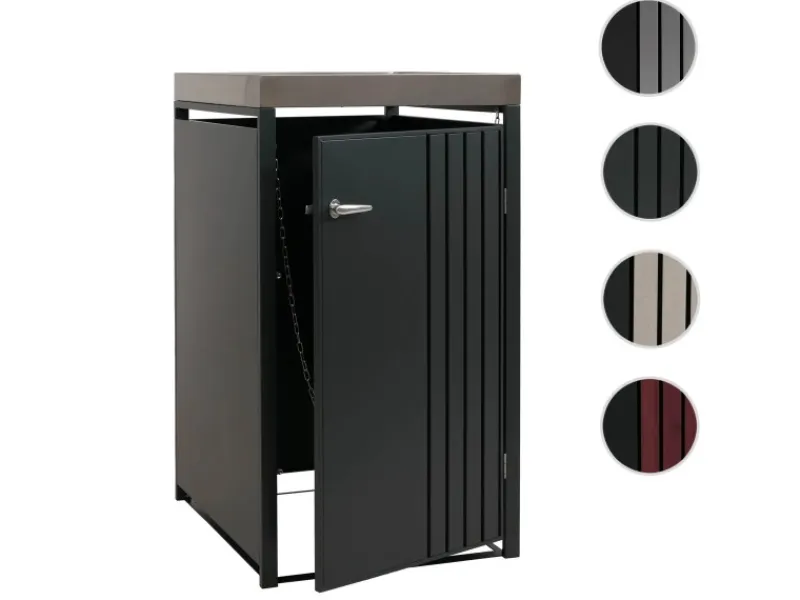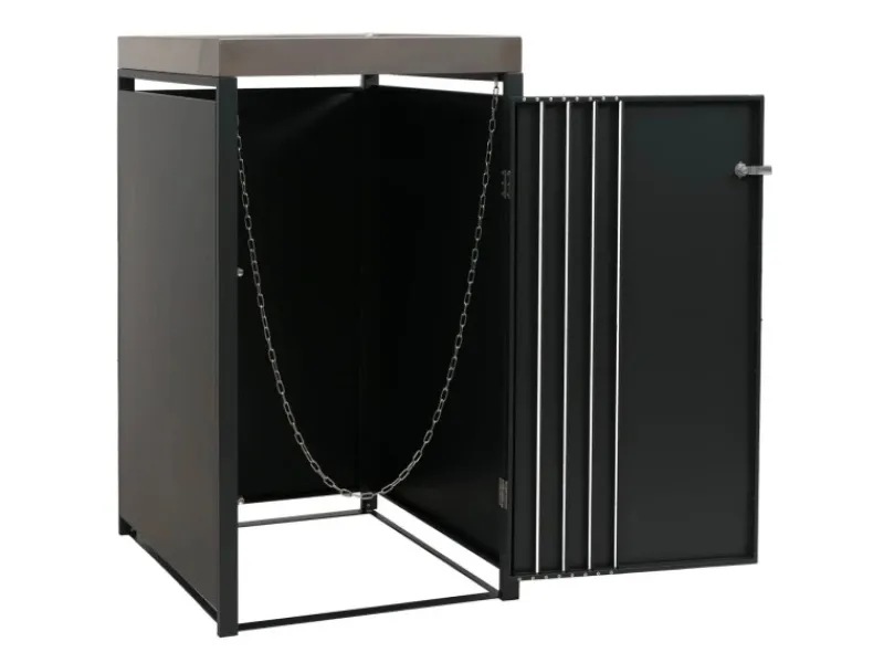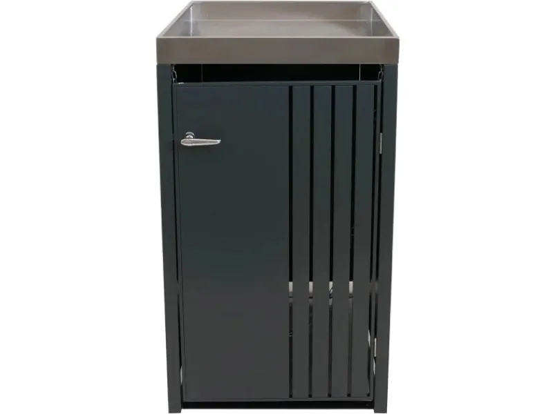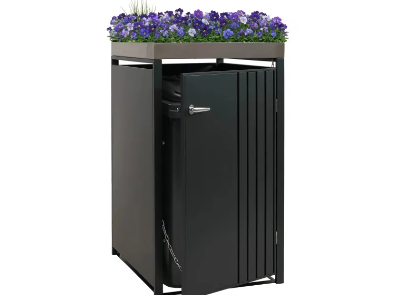 Dank der robusten Bauweise aus verzinktem Stahl überzeugt die Mülltonnenverkleidung durch ihre Wetterbeständigkeit und lange Lebensdauer. Die abschließbaren Türen schützen den Inhalt zuverlässig, während Belüftungsschlitze eine optimale Luftzirkulation gewährleisten. Durch das klare, moderne Design fügt sich die Verkleidung harmonisch in jede Umgebung ein – ob im Garten, an der Hauswand oder in der Einfahrt. Eine praktische und zugleich ästhetische Lösung, um Ordnung und Stil im Außenbereich zu schaffen.