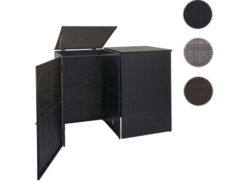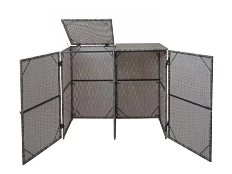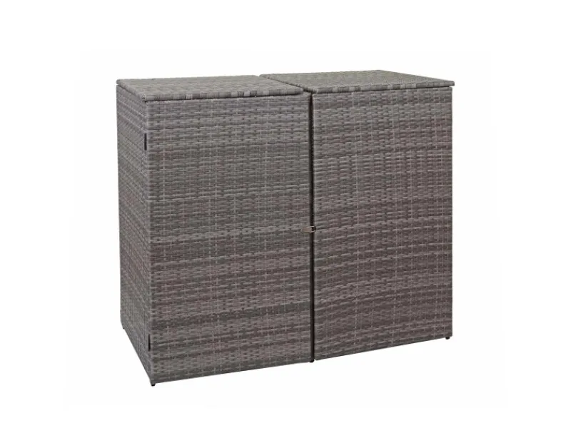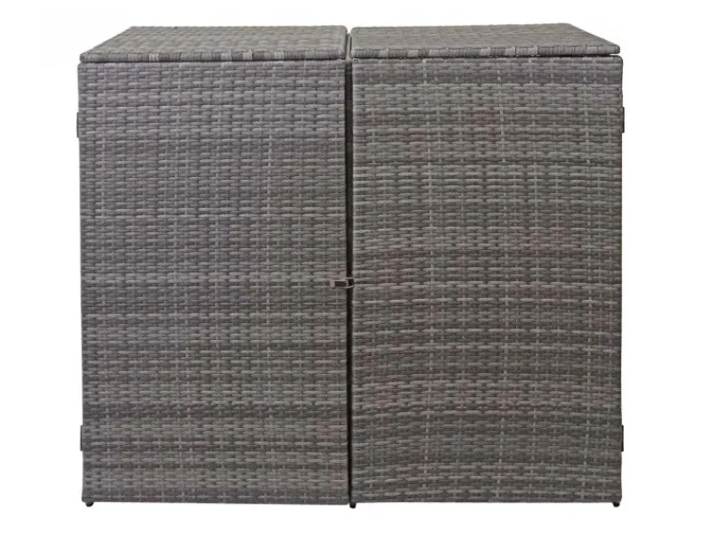 Die Mülltonnenbox überzeugt durch ihr durchdachtes Design und ihre hochwertige Verarbeitung. Der Klappdeckel bleibt dank Halterung sicher offen und erleichtert Dir das Befüllen der Tonnen. Das pflegeleichte Poly-Rattan verleiht der Box eine moderne Optik und ist gleichzeitig robust gegenüber Witterungseinflüssen. Eine clevere Lösung, um Ordnung und Stil in Deinen Garten, Hof oder Eingangsbereich zu bringen.