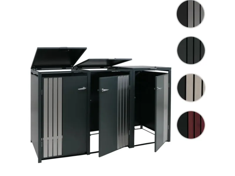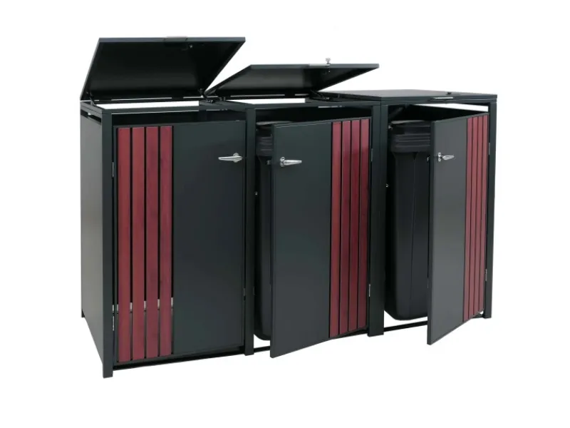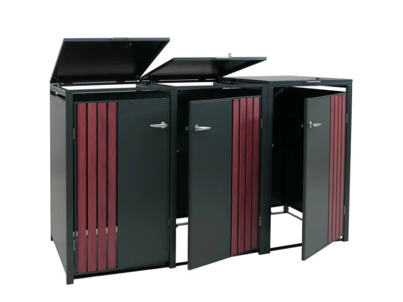 Dank der robusten Bauweise aus verzinktem Stahl überzeugt die Mülltonnenverkleidung durch ihre Wetterbeständigkeit und lange Lebensdauer. Die abschließbaren Türen schützen den Inhalt zuverlässig, während Belüftungsschlitze eine optimale Luftzirkulation gewährleisten. Durch das klare, moderne Design fügt sich die Verkleidung harmonisch in jede Umgebung ein – ob im Garten, an der Hauswand oder in der Einfahrt. Eine praktische und zugleich ästhetische Lösung, um Ordnung und Stil im Außenbereich zu schaffen.