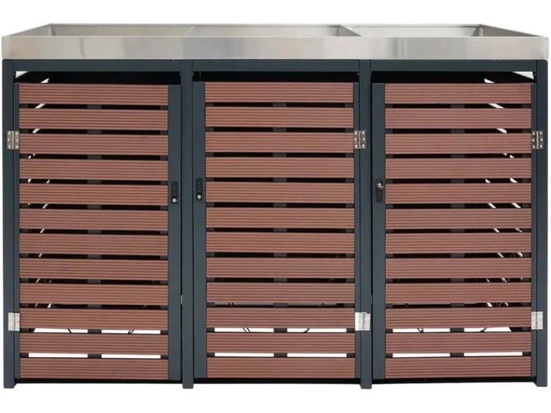 Die Kombination aus WPC-Paneelen und verzinktem Stahlrahmen sorgt für eine besonders langlebige und wartungsarme Konstruktion. Durch das klare, moderne Design fügt sich die Verkleidung harmonisch in jeden Außenbereich ein – ob Garten, Terrasse oder Einfahrt. Der Deckel lässt sich bequem öffnen, während die abschließbaren Türen für Sicherheit und Ordnung sorgen. Dank der Belüftungsschlitze bleibt das Innere stets gut durchlüftet. Eine stabile, pflegeleichte und optisch ansprechende Lösung, um Ihre Mülltonnen elegant zu verbergen und den Außenbereich aufzuwerten.