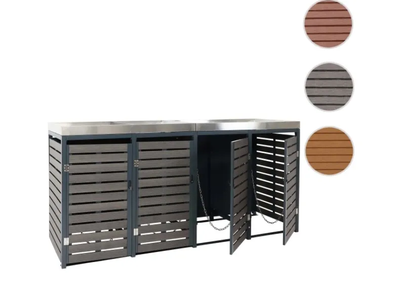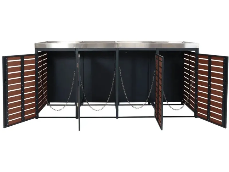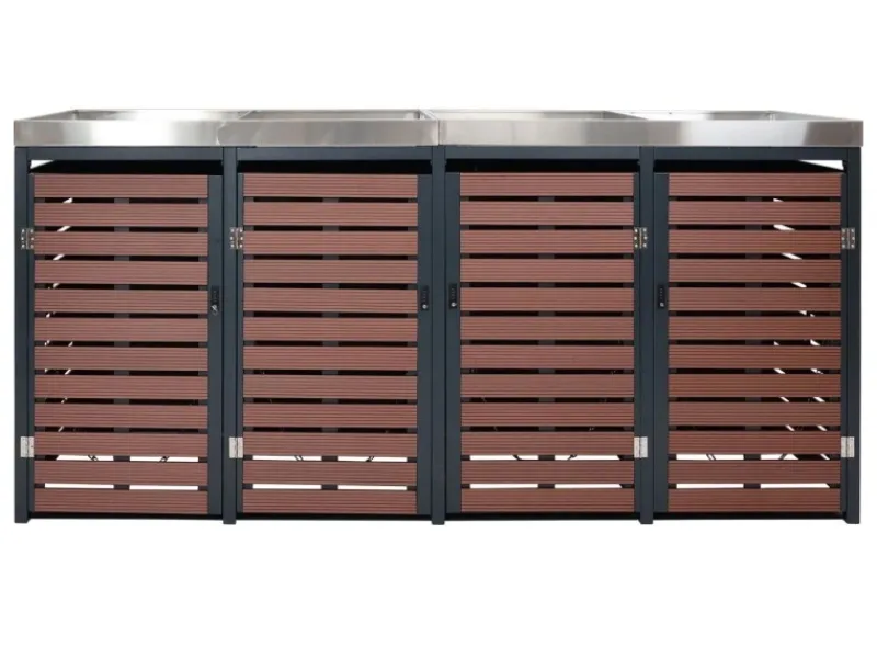 Die Kombination aus WPC-Paneelen und verzinktem Stahlrahmen sorgt für eine besonders langlebige und wartungsarme Konstruktion. Durch das klare, moderne Design fügt sich die Verkleidung harmonisch in jeden Außenbereich ein – ob Garten, Terrasse oder Einfahrt. Der Deckel lässt sich bequem öffnen, während die abschließbaren Türen für Sicherheit und Ordnung sorgen. Dank der Belüftungsschlitze bleibt das Innere stets gut durchlüftet. Eine stabile, pflegeleichte und optisch ansprechende Lösung, um Ihre Mülltonnen elegant zu verbergen und den Außenbereich aufzuwerten.
