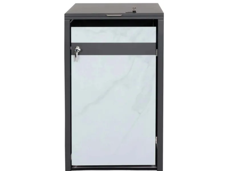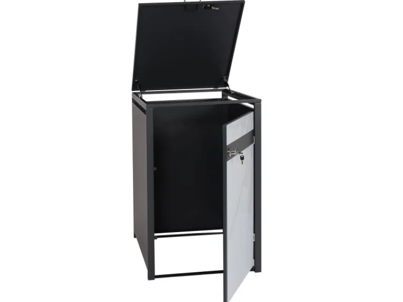 Diese Mülltonnenverkleidung überzeugt durch modernes Design, praktische Funktionen und hohe Sicherheit. Dank der Gasdruckfedern lassen sich die Deckel einfach öffnen, während die separate Abschließbarkeit der Türen und Deckel Deine Mülltonnen zuverlässig schützt. Die Belüftungsschlitze sorgen dafür, dass Kondenswasser vermieden wird, und die wetterfeste Pulverbeschichtung garantiert Langlebigkeit. Ideal, um Deinen Außenbereich sauber und ordentlich zu gestalten.
