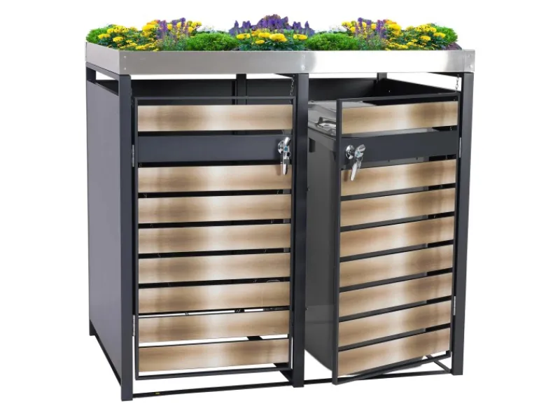 Diese Mülltonnenverkleidung überzeugt durch modernes Design, praktische Funktionen und hohe Sicherheit. Die Kippvorrichtung erleichtert die Müllentsorgung, während die abschließbare Tür zuverlässig Schutz bietet. Belüftungsschlitze verhindern Kondenswasserbildung und sorgen dafür, dass Deine Mülltonnen trocken bleiben. Der Pflanzkasten ermöglicht eine individuelle Bepflanzung, sodass sich die Verkleidung perfekt in Deinen Außenbereich einfügt.
