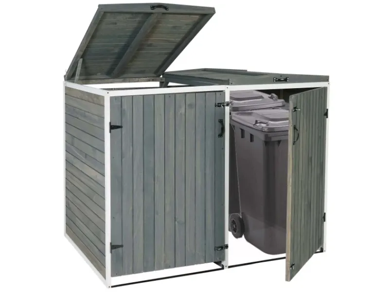 Die Holzverkleidung überzeugt durch ihre durchdachte Konstruktion und natürliche Ästhetik. Der Deckel mit Halterung bleibt beim Befüllen sicher geöffnet, während die abschließbaren Türen und robusten Metallbeschläge für Sicherheit sorgen. Dank der Belüftung ist stets für ausreichend Luftzirkulation gesorgt, und das modulare Design ermöglicht Dir, die Mülltonnenverkleidung flexibel zu erweitern – eine praktische und optisch ansprechende Lösung für Deinen Garten, Hof oder Eingangsbereich.