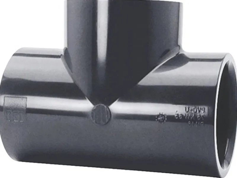 PVC T-Stück 90° mit drei gleichen Klebemuffen, in die PVC-Fitting oder Rohre mit entsprechendem Außendurchmesser eingeklebt werden können.