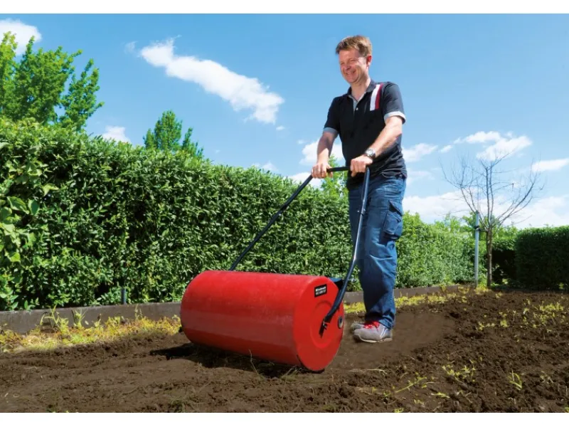 Setzen Sie die Gartenwalze ein, um einen guten Bodenschluss des Saatgutes bei geringem Kraftaufwand zu erreichen. Ziehen Sie dafür nach dem Rasenmähen mit der Wiesenwalze gleichmäßige Bahnen. Dadurch wird ein gleichmäßiger und ästhetischer Bewuchs erzielt. Setzen Sie die Walze auch nach dem Vertikutieren oder Düngen der Rasenfläche ein. Des Weiteren können Sie die Handwalze auch zum Verdichten von sandigen Untergründen benutzen.