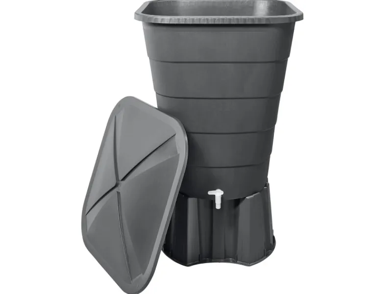 Durch die eckige Tonnenöffnung passt die Regentonne Ibiza perfekt an jede Hauswand und in jede Ecke und lässt sich ohne Flächenverlust mühelos erweitern, um das vorhandene Speichervolumen von 300 Litern bei Bedarf aufzustocken. Die runde Grundfläche verhindert ein Ausbeulen, auch bei voller Befüllung.