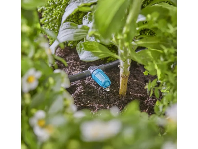 Der regulierbare Reihentropfer 0-15 l/h von Gardena wird zur gezielten und wassersparenden Bewässerung eingesetzt. Die Micro-Drip-System Komponente wird mit dem 4,6-mm-Verteilerrohr verbunden und ist ideal für die Bewässerung von in Reihen stehenden Topf- und Beetpflanzen mit unterschiedlichem Wasserbedarf geeignet. Die Wasserabgabe kann individuell zwischen 0 und 15 Litern pro Stunde eingestellt werden. Das ermöglicht eine individuelle Bewässerung, wodurch der Reihentropfer bestens für einen unterschiedlichen oder bei einem steigenden Wasserbedarf der Pflanzreihe geeignet ist. Durch die clevere Easy & Flexible Verbindungstechnik wird der Reihentropfer bei der intuitiven Installation einfach mit dem Verteilerrohr verbunden. Ebenso komfortabel erfolgt das Lösen vom Rohr für eine flexible Anwendung. In der abnehmbaren Einstellhülse ist die Reinigungsnadel enthalten, die mögliche Verstopfungen im Tropfer löst.