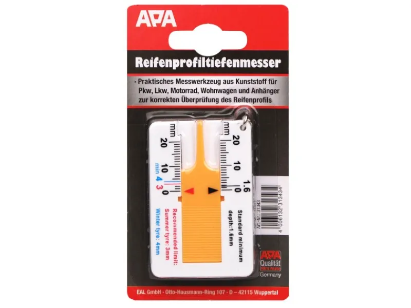 Der Apa Reifenprofiltiefenmesser ist ein praktisches Messwerkzeug für PKW, LKW, Motorräder, Wohnwagen und Anhänger. Die Überprüfung des Reifenprofils kann jederzeit und überall durchgeführt werden. Der Messbereich reicht von 0 bis 20 mm.