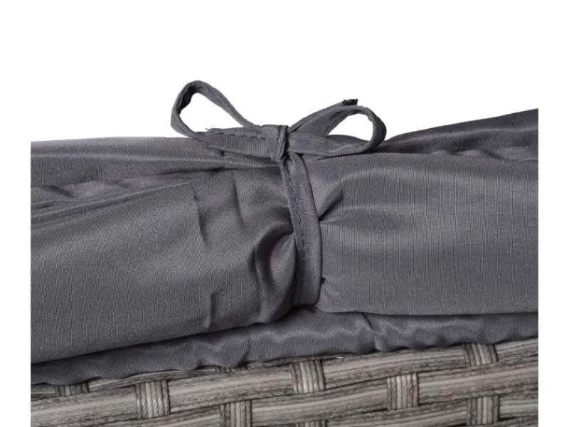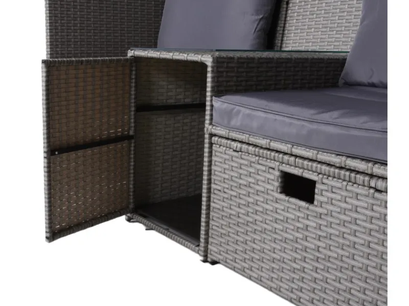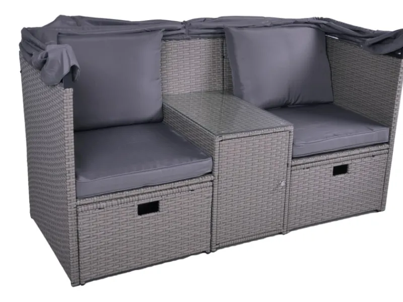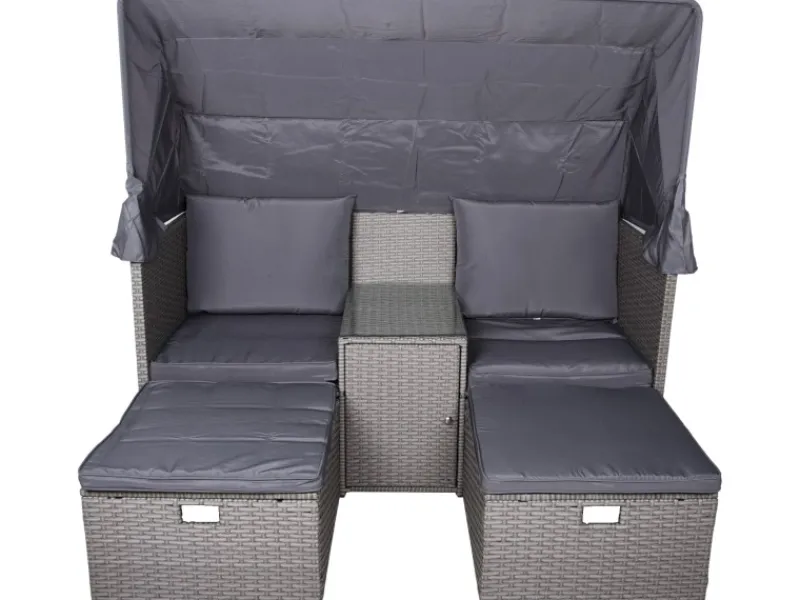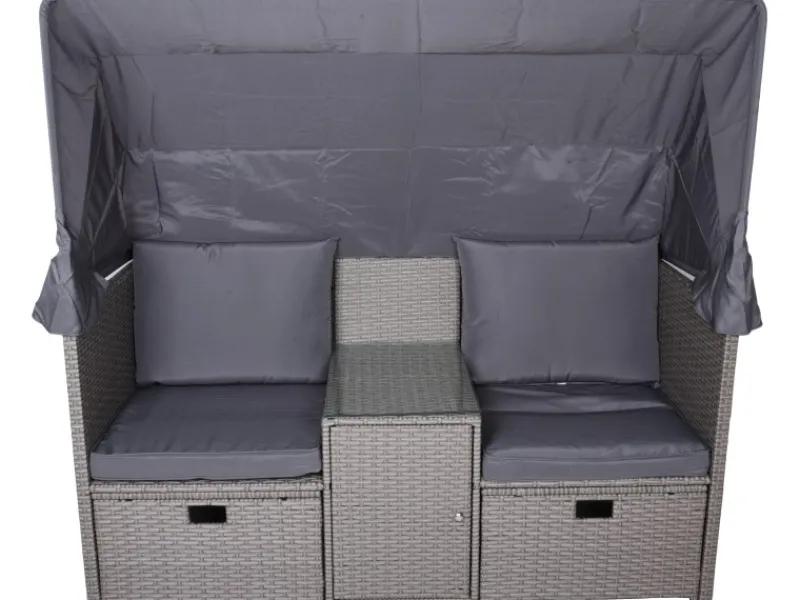 Die Lounge bietet bequem Platz für bis zu zwei Personen und verfügt über zwei Hocker, die zum Entspannen einladen. Der Beistelltisch bietet Platz für Getränke und Snacks, damit Sie alles griffbereit haben. Ein besonderes Highlight dieser Lounge ist das silbergraue Sonnendach, das vor direkter Sonneneinstrahlung schützt und Ihnen ermöglicht, auch an sonnigen Tagen bequem im Freien zu sitzen.