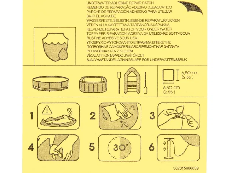 Die wasserfesten wie selbstklebenden Reparaturflicken von Bestway sind eine schnelle und einfache Methode, um Löcher in Aufblasartikeln zu reparieren. Jede Packung enthält 10 der strapazierfähigen Reparaturflicken, welche sich hervorragend zum Flicken von Booten, Pools, Spas und Luftmatratzen eignen. Um die selbstklebenden Reparaturflicken anzubringen, reinigen Sie zunächst die betroffene Stelle, ziehen Sie die Rückseite des Flickens ab und kleben Sie ihn sauber auf. Lassen Sie den Reparaturflicken nach dem Aufbringen 30 min aushärten, bevor Sie das Produkt erneut aufpumpen. Da die Flicken wasserfest sind, können Sie problemlos auch unterhalb der Wasserlinie des Bootes, Pools oder Spas verwendet werden.