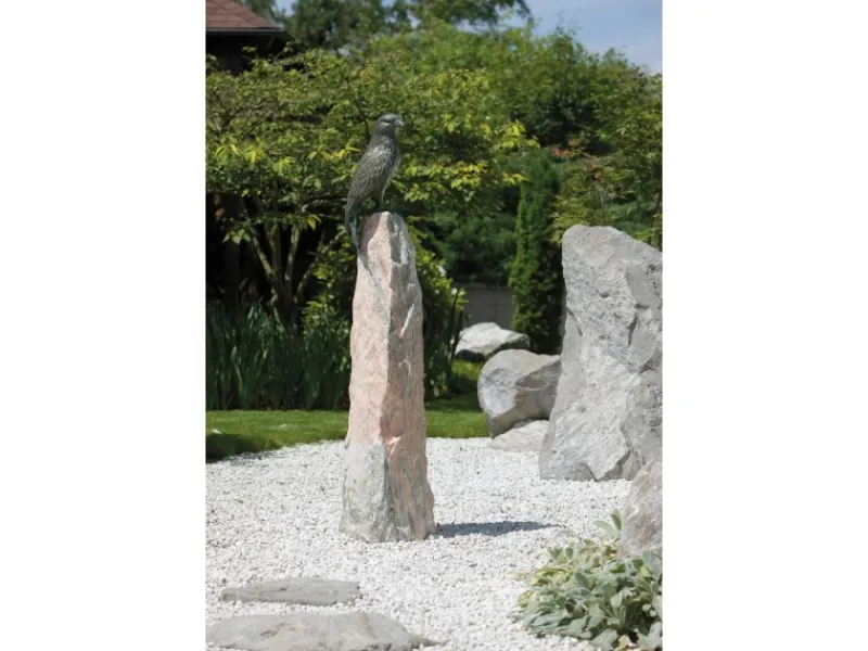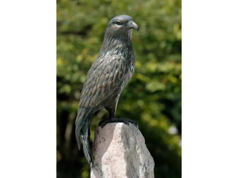 Die Rottenecker Bronze-Skulptur Roter Milan ist eine imposante Skulptur zur Gartendeko. Sie ist absolut wetterbeständig und frostfest. Mittels der beiliegenden Gewindestifte lässt sich die Figur auf Stein oder Holz sicher befestigen.