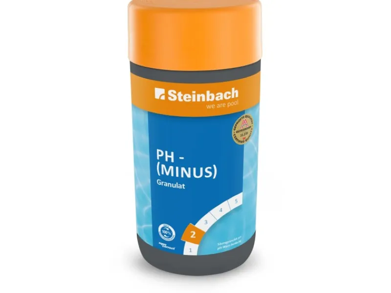 Durch die Aufrechterhaltung des empfohlenen pH-Mittelwertes von 7 bis 7,4 können verwendete Wasserpflegeprodukte bei geringer Dosierung maximal wirken und die Wasserqualität möglichst hoch halten. Sollte der pH-Wert einmal über dem optimalen Bereich liegen, kann er mit dem Steinbach pH-minus Granulat wieder gesenkt werden.