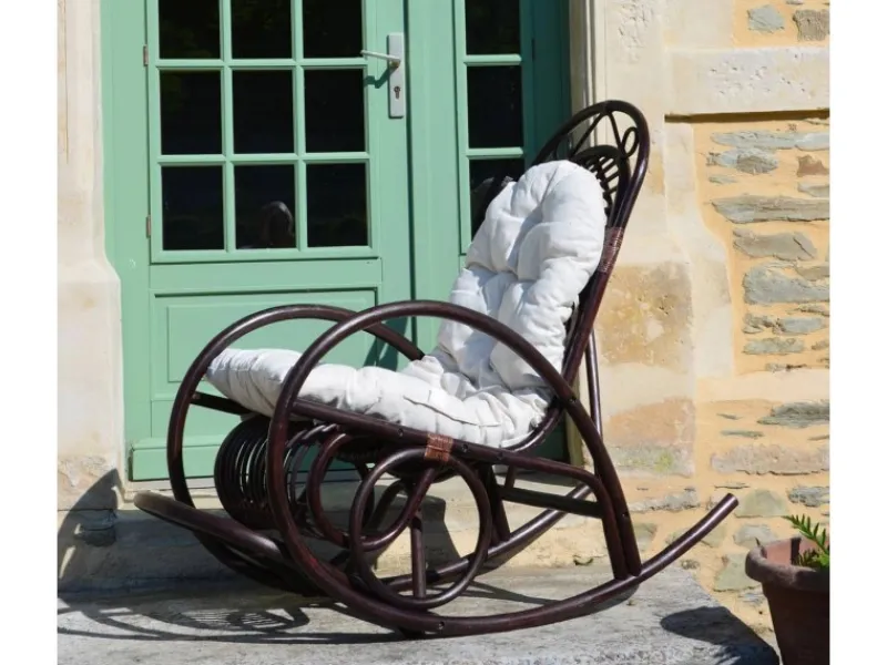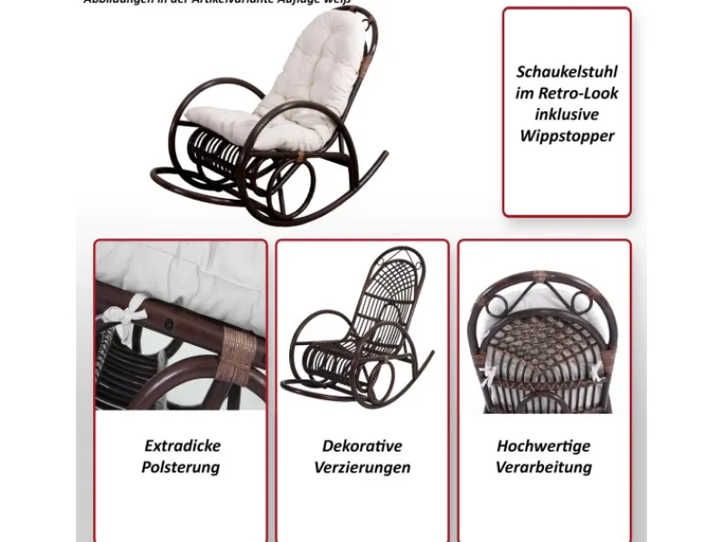 Die wunderschön verschnörkelten Armlehnen unterstreichen den Retro-Look, den Schaukelstühle generell verbreiten, und macht dieses Produkt zu einem immer modernen Klassiker. Für langanhaltende Freude sorgt das stabile Holzgestell mit schönem Rattangeflecht, das den Bezugsstoff farblich bestens ergänzt. Dazu kommt noch die hochwertige und bequeme Textilauflage die zu stundenlangem Verweilen einlädt.