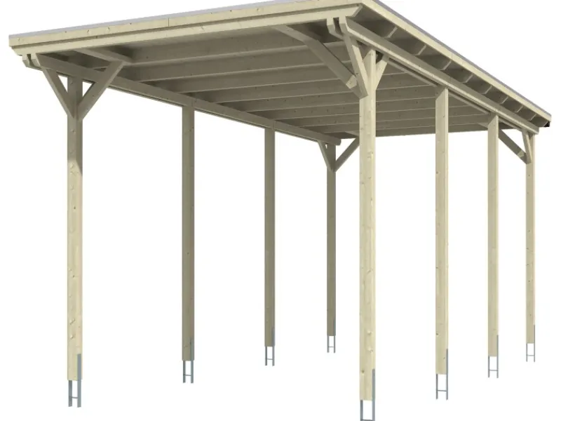 Der Carport steht auf 8 robusten Pfosten mit einer Stärke von 12 cm x 12 cm zum Einbetonieren, die eine optimale Stabilität für das Grundgerüst gewährleisten. Das lasierte Leimholz in Schiefergrau weist eine hohe Formstabilität auf. Dadurch gehört es zu den härtesten und stabilsten Konstruktionsmaterialien. Die lasierte Oberflächenbehandlung bildet einen optimalen Rundumschutz. Sie ist atmungsaktiv und schützt vor Feuchtigkeit, Insekten und Pilzen. Des Weiteren ist sie beständig gegen Sonnen- und UV-Einstrahlung.
