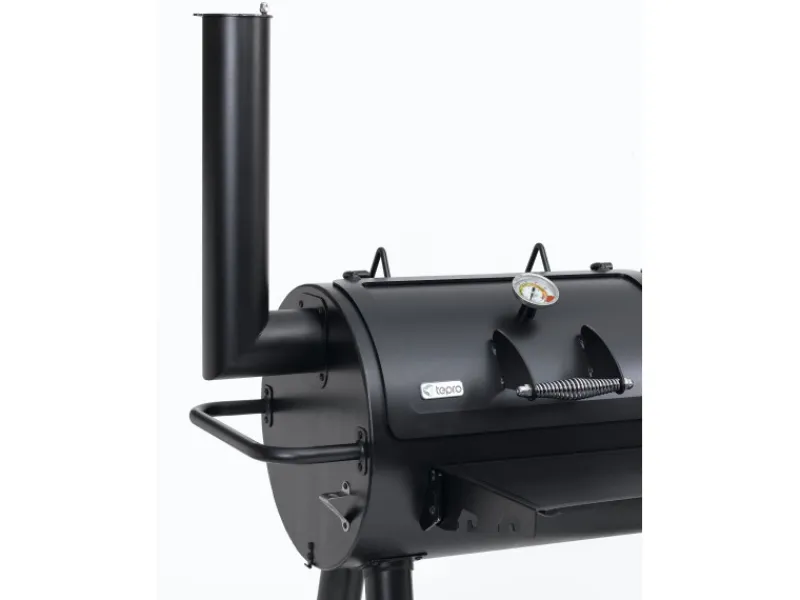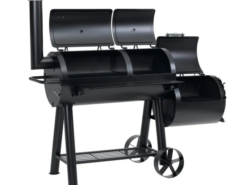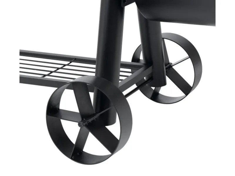 Der massive Tepro Smoker Indianapolis im Western Style verbindet verschiedene Grillmöglichkeiten. So kann zum einen das Grillgut traditionell auf der vorgesehenen Grillfläche direkt über der Glut zubereitet werden. Zum anderen kann das Fleisch auch in der Abluft eines Holzfeuers gegart werden. Dies ist durch die spezielle Bauform des Smokers möglich. Zusätzlich bietet er eine gesunde Art zu Grillen, denn durch die Zubereitung im Rauch können weder Fett noch Flüssigkeiten in die Flamme tropfen und gesundheitsschädliche Stoffe verursachen. Neben dem modernen Räuchern kann durch den 4-geteilten Grillrost in der Garkammer auch indirekt gegrillt werden. Die indirekte Grillmethode, bei der das Grillgut im geschlossenen Raum liegt und nicht direkt über der glühenden Kohle platziert ist, kann mit diesem Smoker einfach umgesetzt werden. Dieser Smoker mit einer Materialstärke von bis zu 5 mm ist besonders robust in seiner starken Ausführung. Hier wurde an alles gedacht, was das Smoker-Herz höher schlagen lässt. So beinhaltet dieser Grill 2 Deckel mit integrierten Thermometern für ein bequemes Beobachten der Temperatur in der großen Garkammer. Auch bei der kleinen Garkammer wurde an alles gedacht, denn der Deckelhalter lässt sich im Handumdrehen auf die gewünschte Position stellen, so dass die Luftzirkulation eingestellt ist. Die Deckelform der kleinen Garkammer ist so gefertigt, dass sie im geschlossenen Zustand als Kochfeld für einen Topf verwendet werden kann. Durch die vorhandenen Räder kann dieser schnell überall im Garten oder auf der Terrasse zum Einsatz gebracht werden.