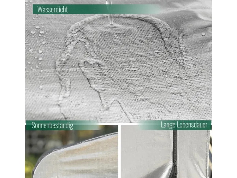 Die dicke Plane ist PE Material verarbeitet, UV beständig und 100% wasserdicht durch verschweißte Nähte.
