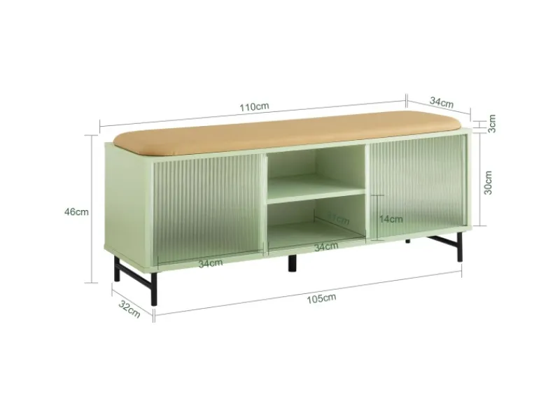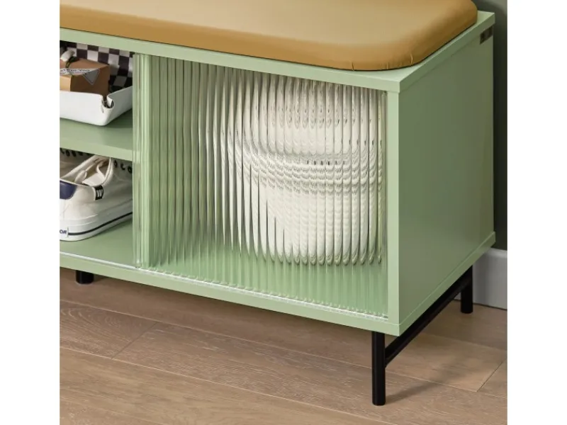 Diese Schuhbank ist mit einem weichen gelben Sitzpolster aus PU-Leder ausgestattet, um sich im Sitzen die Schuhe an- oder auszuziehen.