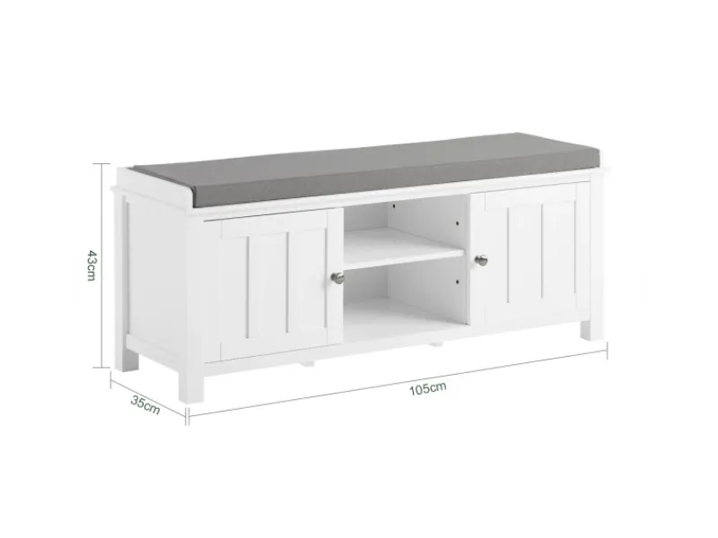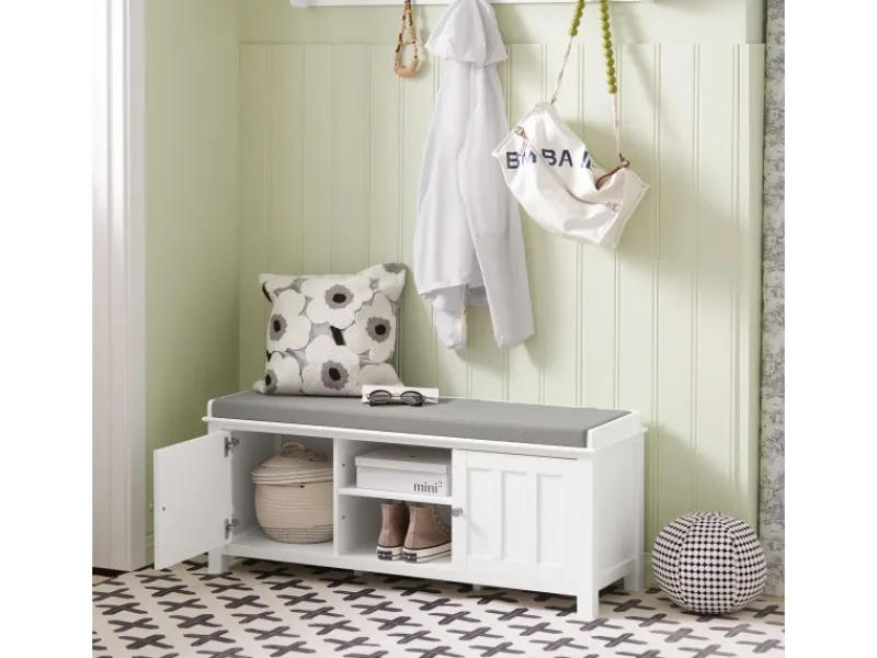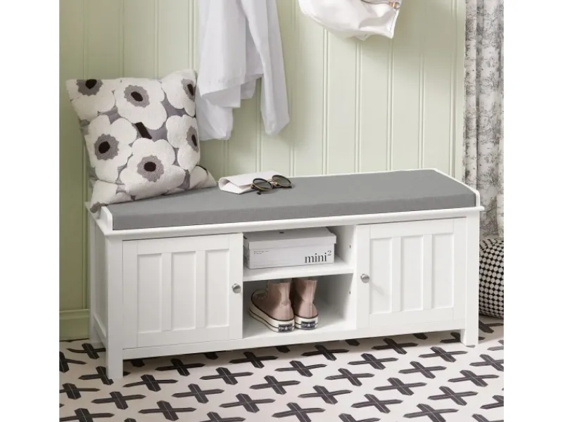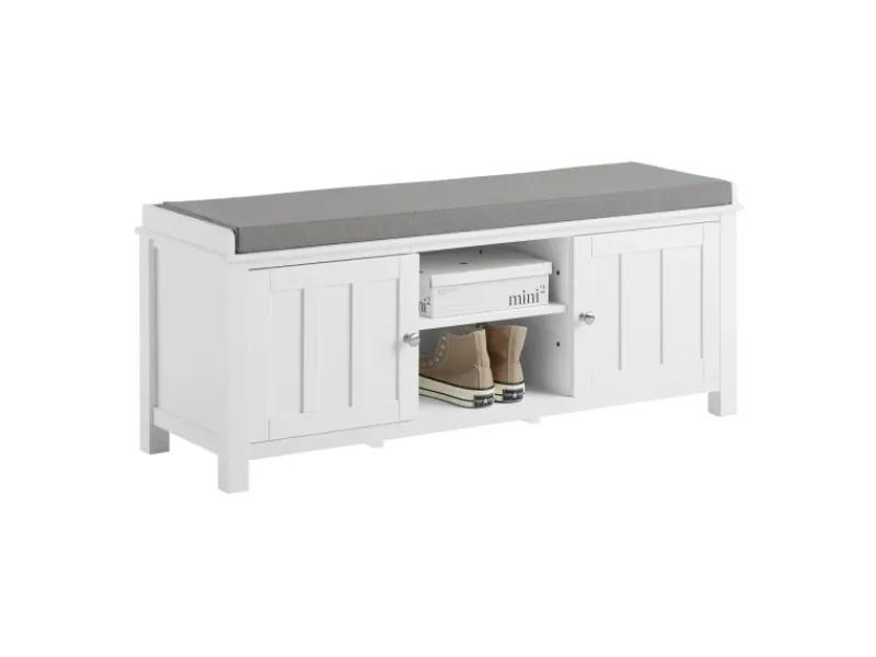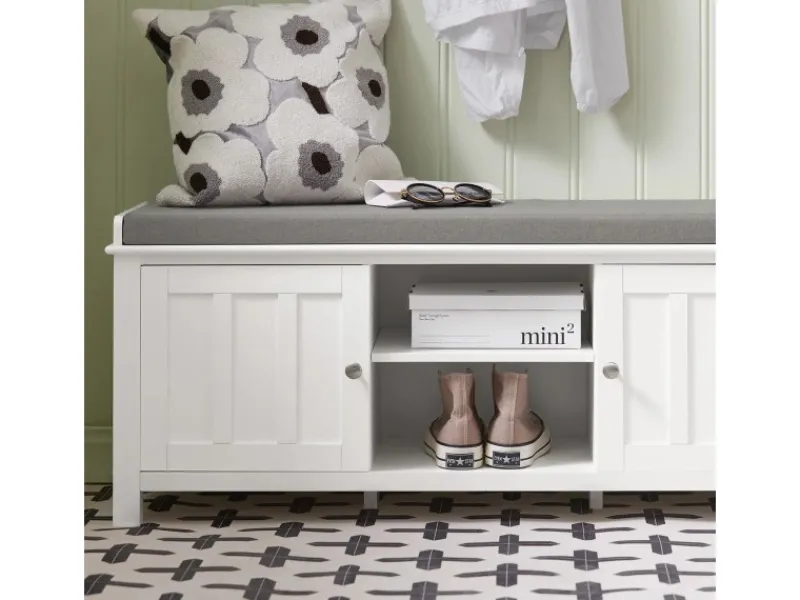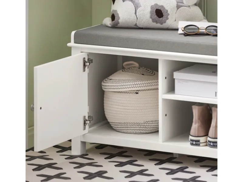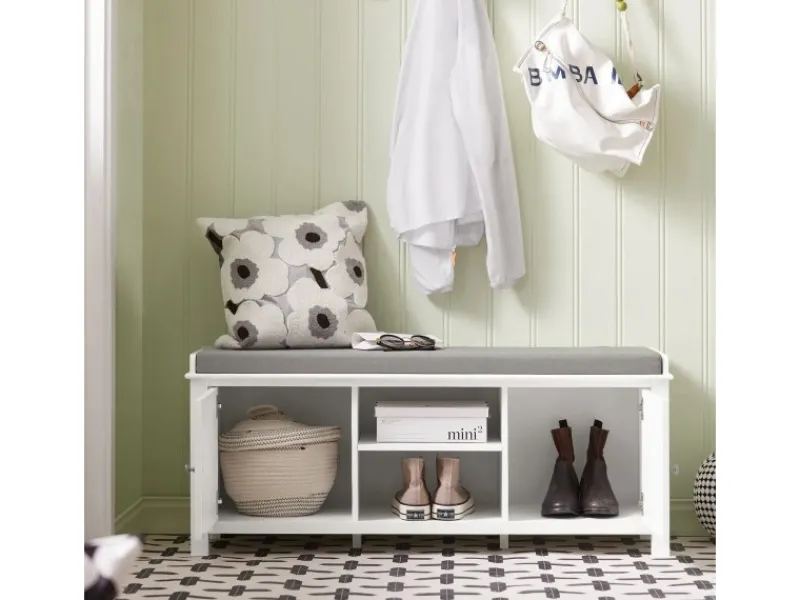 Mit ihren zwei Türen und zwei Ablagen bietet die Bank Platz für deine Schuhe oder andere kleine Gegenstände.